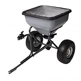 The spreader is constructed with a 1-inch powder-coated steel tube frame, a heavy-duty plastic hopper with a wrap-around support for additional strength, and metal gears with grease fittings for durability and reduced maintenance. Two heavy-duty 15-inch pneumatic treaded tires with steel wheels provide ease of movement over many different terrains and in even difficult conditions. A handy rain cover is provided for spreading in inclement weather conditions, and the axle and all hardware are rust resistant. All parts are covered with a 90-day limited warranty, and assembly should take about thirty minutes.--Jeffrey Dalto